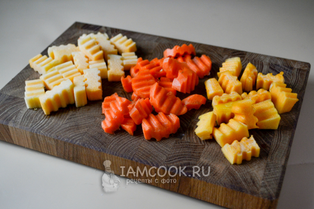 Морковь, тыкву и кабачок нарежьте кусочками. Слишком мелко или, наоборот, крупно нарезать не стоит. Размер кусочков - примерно 1х1,5-2 см.