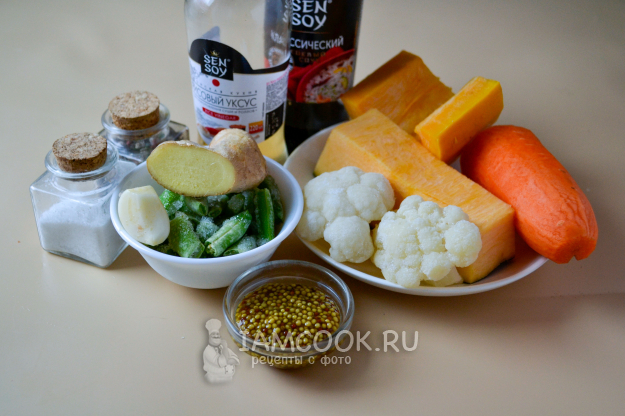 Соберите продукты для приготовления овощей на пару с соусом. Все овощи вымойте, обсушите, очистите от кожуры.
