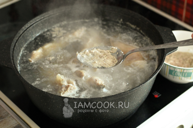 Ближе к концу варки отлейте в мисочку пару половников бульона и остудите его до чуть-тёплого состояния.