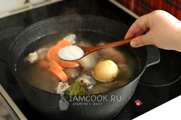 Когда "пенная вечеринка" в кастрюле закончится, добавьте в неё луковицу в шелухе (помыть не забудьте), очищенную морковь (нарезанную крупно или целиком), пару лавровых листочков и чайную ложку горошин чёрного перца. Сразу посолите по вкусу.