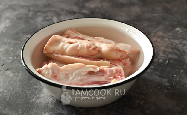 Теперь сложите свиные ножки в тазик и залейте холодной водой. Оставьте вымачиваться на 2 часа. Вымачивание - важный этап, так из ножек убирается специфический запах и лишняя кровь. Вымачивать можно и дольше (некоторые вымачивают до двух суток), но тогда нужно менять периодически воду и убрать тазик в холодильник, чтобы свиные ножки не испортились.