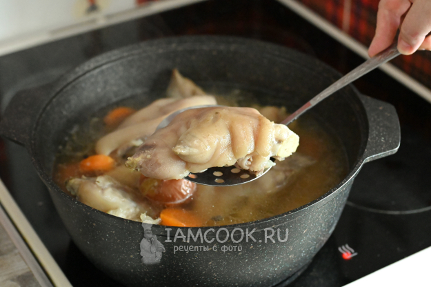 Время варки зависит от самих свиных ножек и ваших предпочтений по мягкости мяса. Нравится погрызть хрящики - варите 2 часа. А если любите, чтобы мясо отходило от косточек, то время варки - от трёх часов и выше.