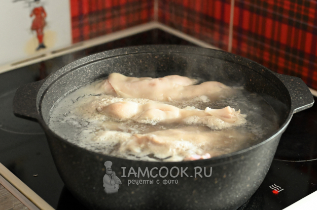 Убавьте огонь до минимума и варите свиные ножки до готовности.