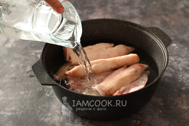 После вымачивания сложите свиные ножки во вместительную кастрюлю и залейте свежей водой.