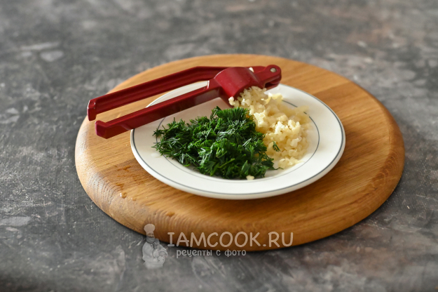 Нарубите мелко укроп, чеснок пропустите через пресс.