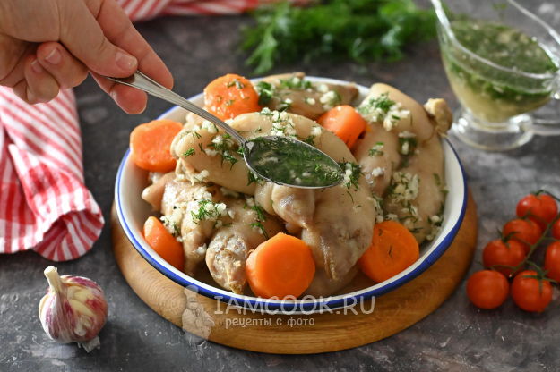 Это блюдо едят без церемоний. Никаких вилок и ножей! Руками берёте ножку, разбираете её на части и можно макнуть в чесночную подливу. А потом ещё и пальцы облизать!