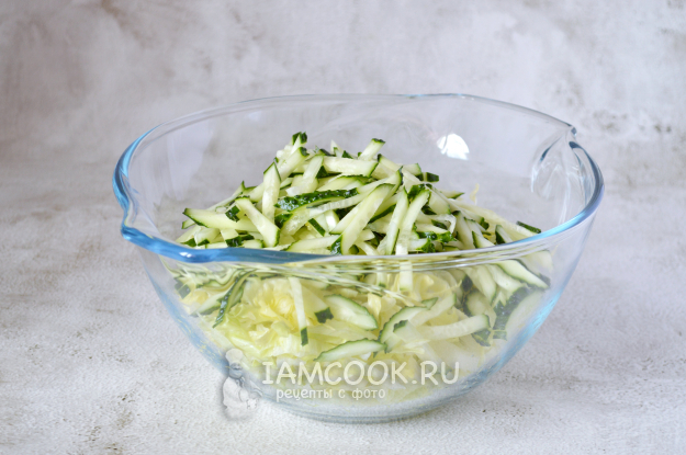 Салат айсберг нарезать соломкой и выложить в глубокий салатник.