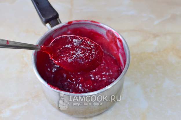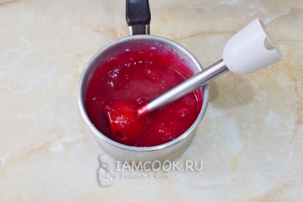 Когда ягоды оттаяли и масса стала горячей, пробейте всё погружным блендером в однородную массу. Затем верните начинку на огонь.