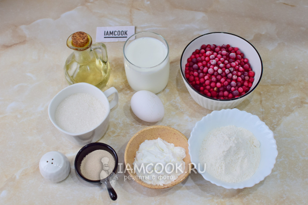 Перед началом приготовления пирожков с брусникой из дрожжевого теста на сковороде соберите необходимые ингредиенты по списку. Молоко нагрейте до теплого состояния. Муку просейте через сито, чтобы насытить кислородом.