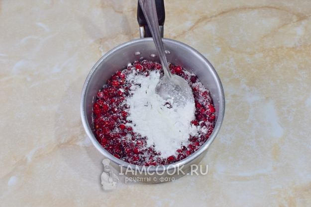 В это время займитесь приготовлением начинки. Смешайте бруснику с сахаром и крахмалом. Поставьте на огонь. При необходимости можно добавить немного воды.
