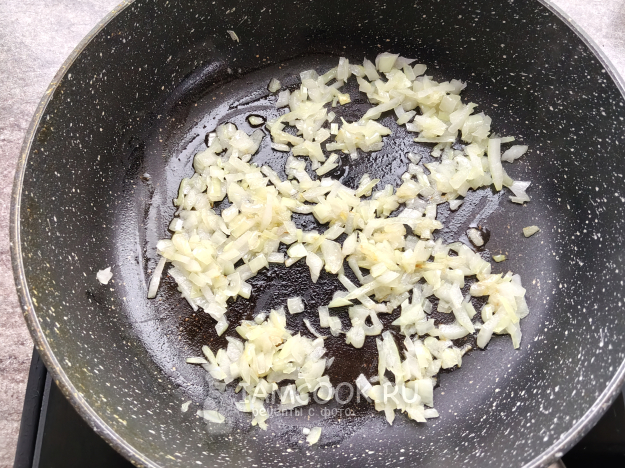 Лук мелко нарезать, поджарить на масле до мягкости.