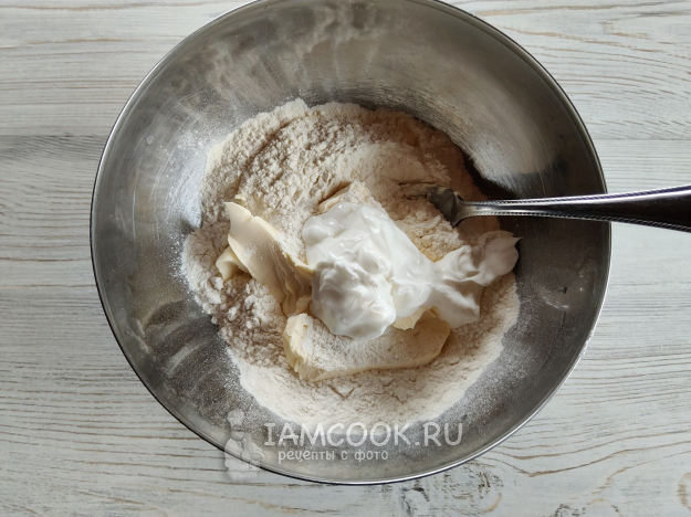 В муку добавить соль, разрыхлитель, мягкое масло и сметану.
