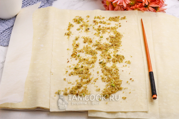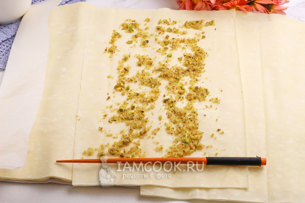 Разверните листы теста, я использовала по два сразу, так как они очень тонкие. Разрезала пополам по длине палочки для суши. Выложите немного фисташковой начинки.