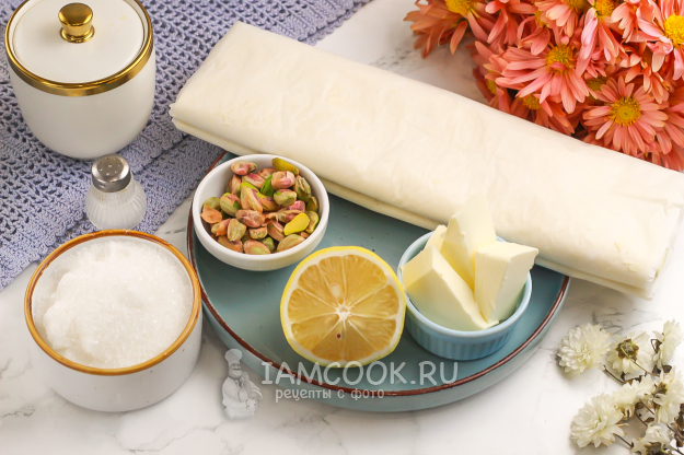 Продукты для приготовления пахлавы с фисташками - перед вами! Тесто заранее разморозьте, если приобретали его замороженным. Фисташки очистите от скорлупы.