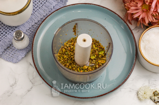 Фисташки измельчите в крошку. Я попыталась измельчить их без сахара, но это не получилось. Поэтому добавляйте сахар обязательно.