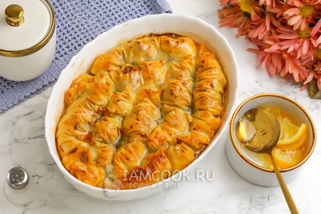 Небольшим кусочком масла смажьте форму и выложите в нее приготовленные рулетики. Выкладывайте плотно, чтобы они не развернулись. Разогрейте духовку до 200 градусов и запеките пахлаву примерно 15-20 минут.