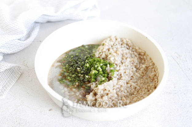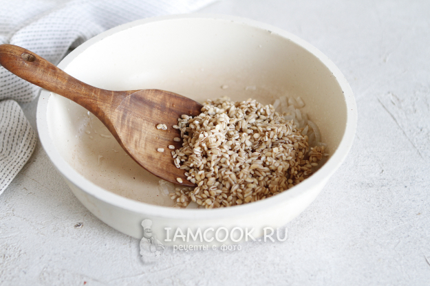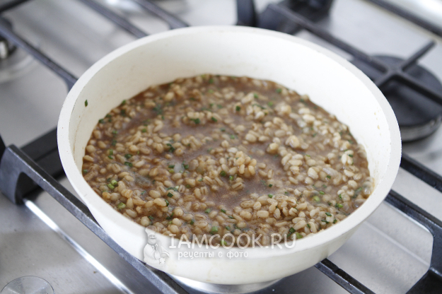 Перловку промойте под проточной водой и откиньте на дуршлаг. Добавьте в сковороду. Обжарьте ее в течение 2 минут на небольшом огне.
