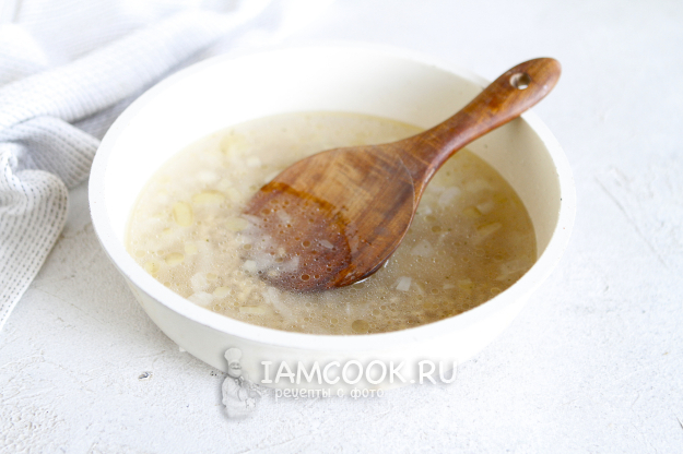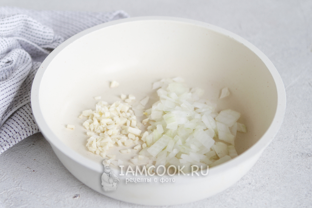 Разогрейте сковороду и на растительном масле обжарьте чеснок с луком до мягкости.