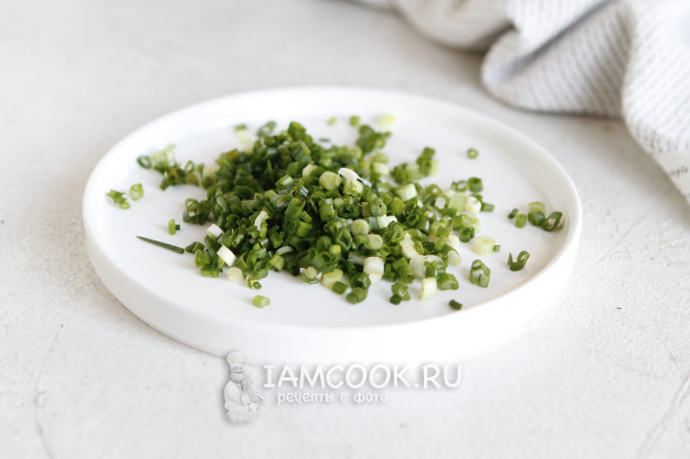 Лук зеленый также тщательно промойте под проточной водой. Обсушите бумажным полотенцем и мелко нашинкуйте.