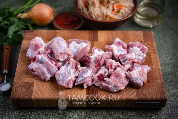Все ингредиенты для приготовления бигуса в афганском казане соберите по указанному списку. Реберные пластины промойте в холодной воде. Лук и чеснок почистите. С помощью дуршлага промойте квашеную капусту в холодной воде.