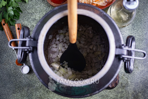 На дно казана залейте растительное масло и выложите к нему лук, поставьте на средний огонь. Не закрывая крышку, обжаривайте 5-8 минут, помешивая лопаткой.