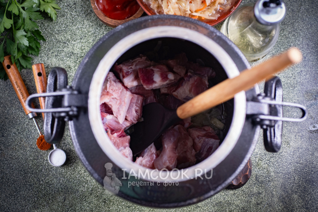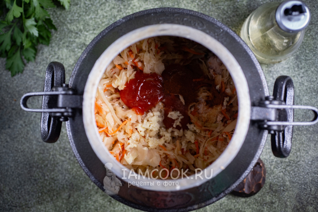 После чего в казан выложите квашеную капусту, томатный соус, соль, специи, выдавите через чеснокодавилку чеснок, перемешайте все.