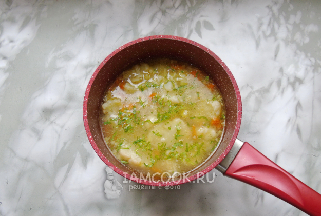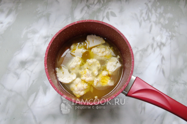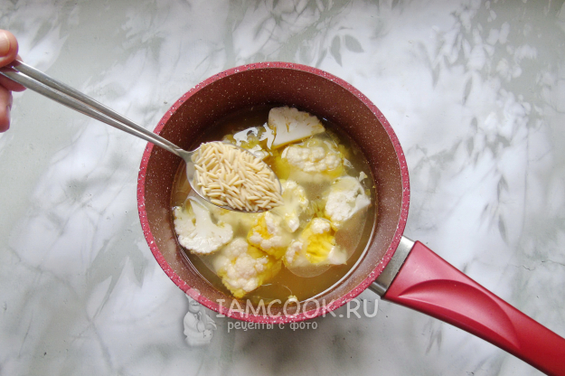 Варите суп 10 минут. Тем временем цветную капусту разберите на соцветия, помойте и добавьте в кастрюлю. Крупные соцветия разрежьте на 2-3 части. Посолите и поперчите по вкусу.