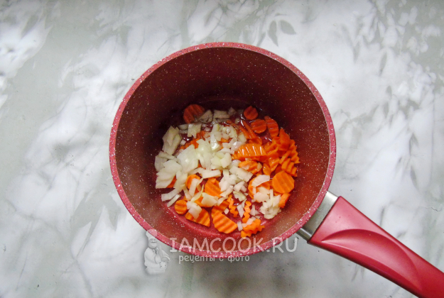 Морковь и репчатый лук очистите, помойте и нарежьте произвольно. Выложите в кастрюлю и налейте растительное масло. Пассеруйте овощи 5-6 минут.