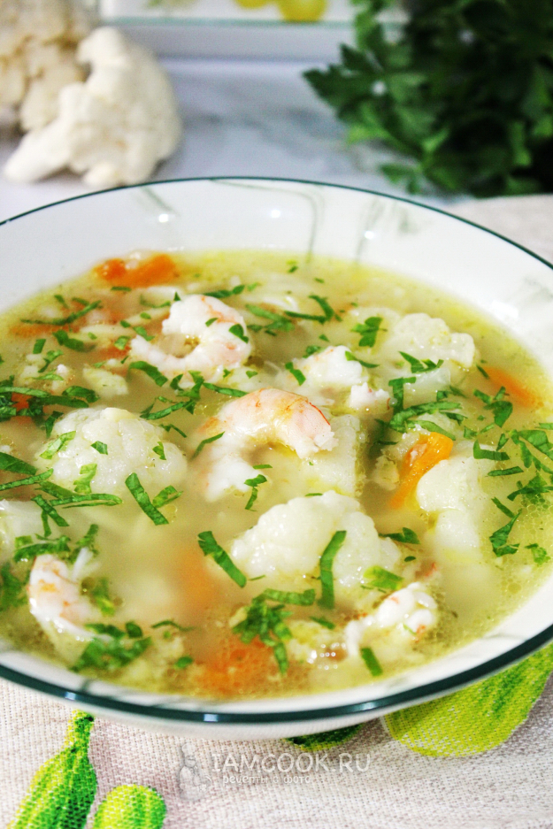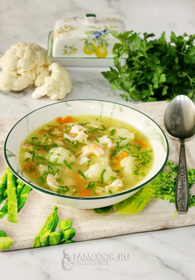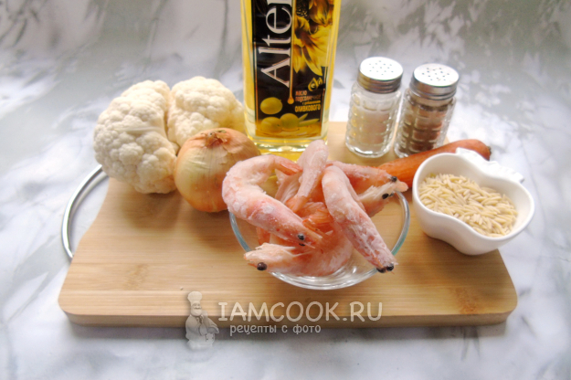 Соберите ингредиенты для приготовления супа из цветной капусты с креветками.