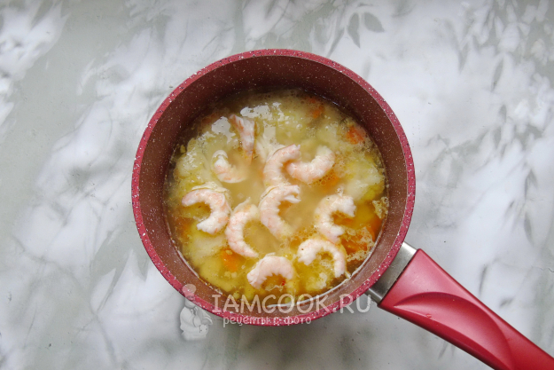 Очищенные креветки добавьте в суп за 5 минут до окончания приготовления.