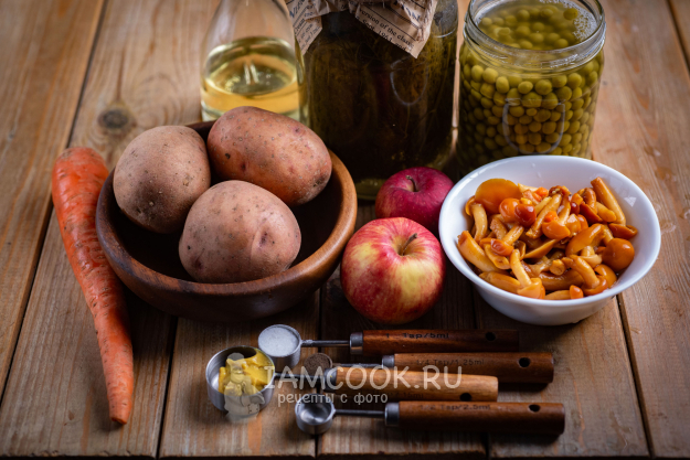 Все ингредиенты для постного салата Оливье с опятами соберите по указанному списку. Морковь и картофель тщательно промойте в проточной воде. Слейте с консервированного горошка аквафабу (жидкость, в которой плавает горошек).