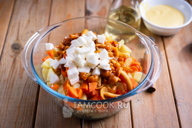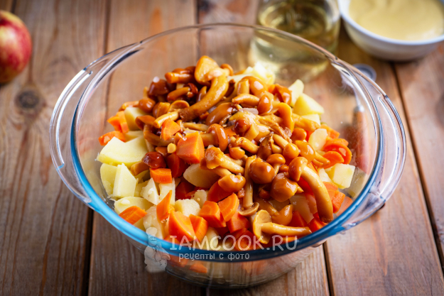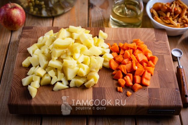 Добавьте в миску нарезанные картофель и морковь, затем грибы.
