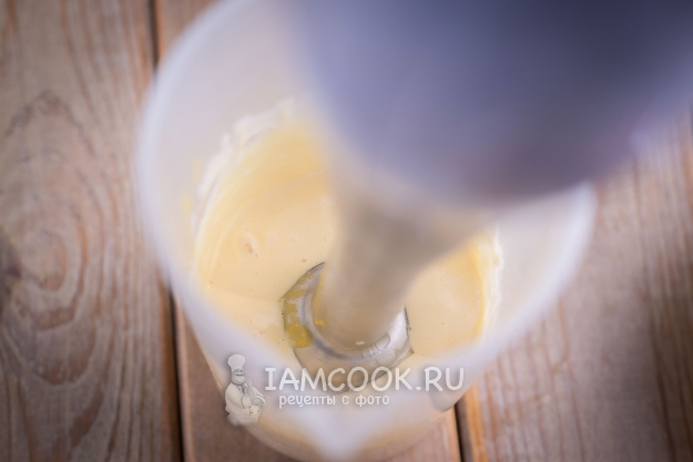 Растительное масло заливайте тонкой струйкой и при этом погружным блендером все время взбивайте ингредиенты до загустения.