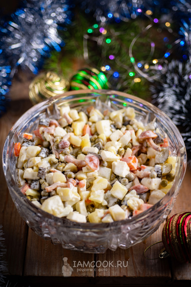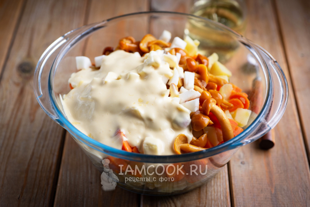 Готовый постный салат Оливье с опятами выложите в салатную миску для подачи и подавайте к столу. Приятного аппетита!