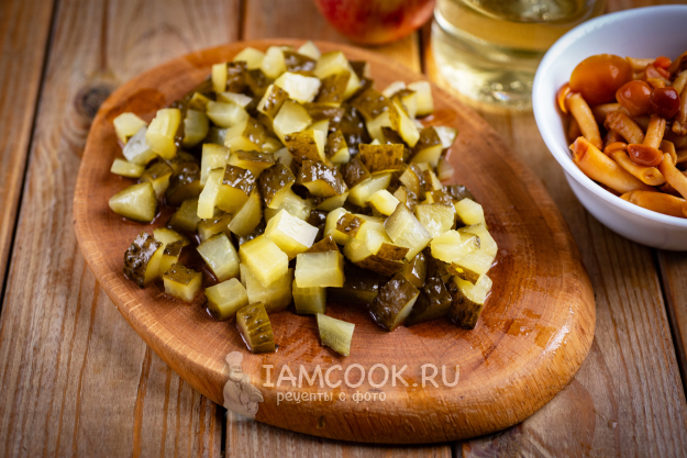 Продолжим готовить салат. Огурчики нарежьте небольшими кубиками.