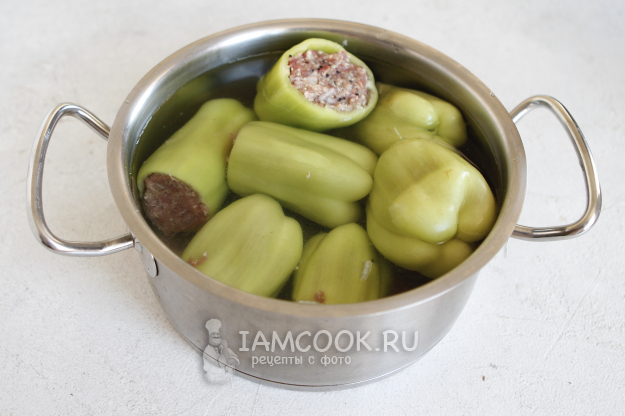 Перцы сложите в кастрюлю. Влейте достаточное количество воды, она должна покрывать перцы, и отправьте на плиту.