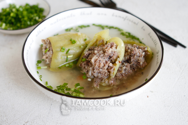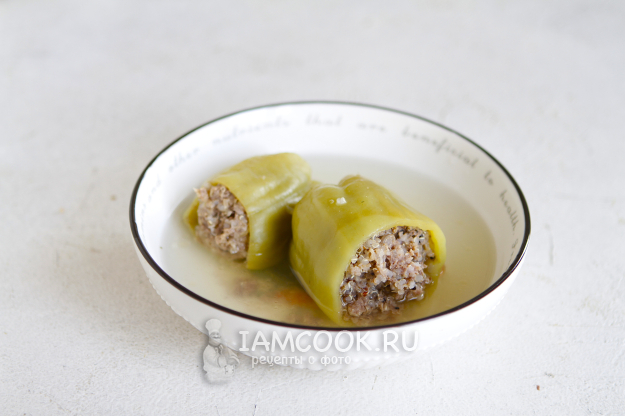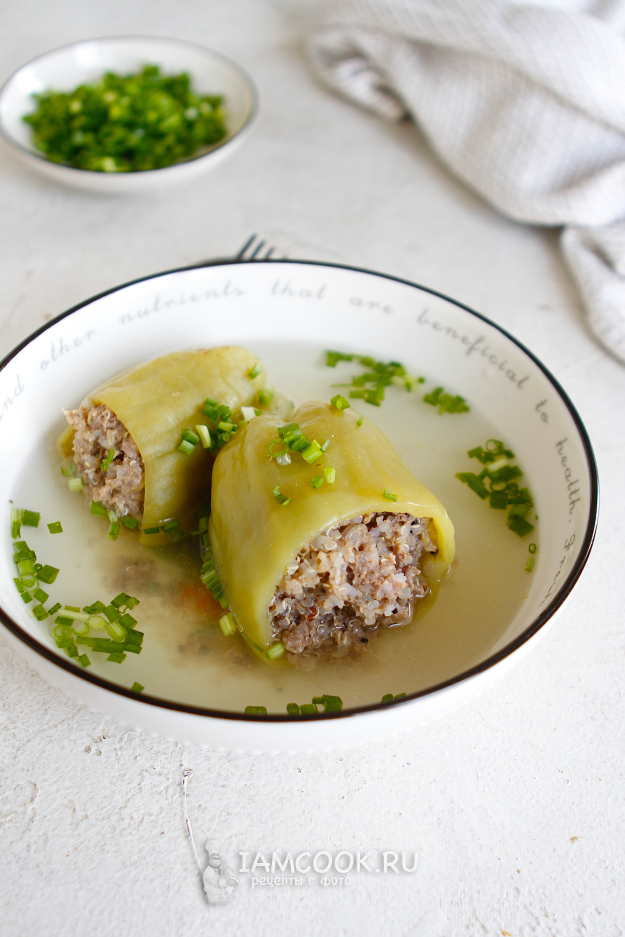 Фаршированные перцы с киноа и фаршем готовы. Разложите по тарелкам с бульоном и подавайте к столу.
