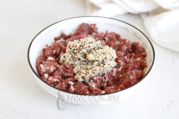 Перемешайте, добавьте специи по вкусу и киноа. Тщательно вымесите фарш.