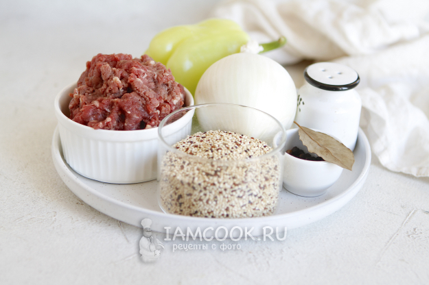 Соберите все необходимые продукты по списку и приступим к приготовлению фаршированного перца с киноа и фаршем.