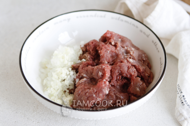 Почистите лук, мелко его нашинкуйте и добавьте к фаршу.
