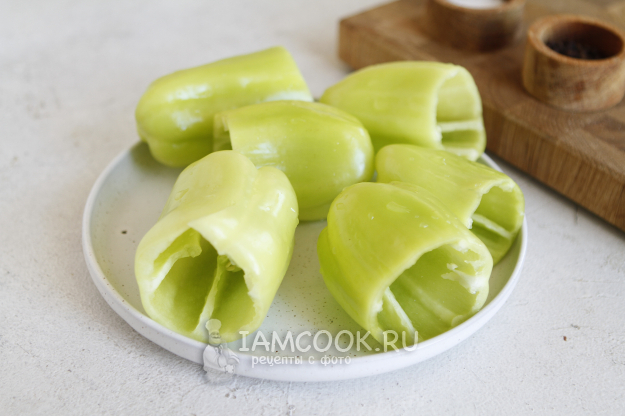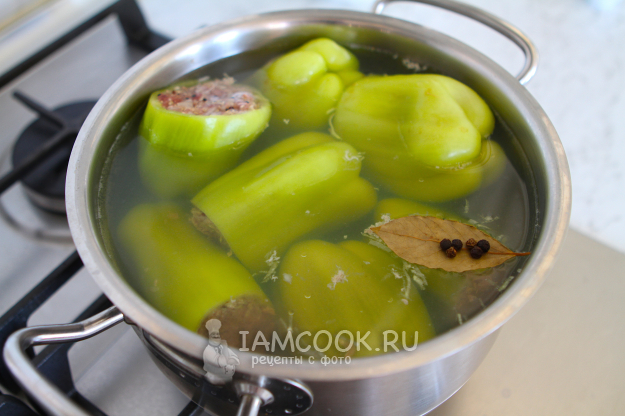 Как только закипит вода, снимите пенку. Слегка посолите. Добавьте несколько горошин черного перца и лавровый лист. Кастрюлю закройте крышкой и варите перцы 45-50 минут.