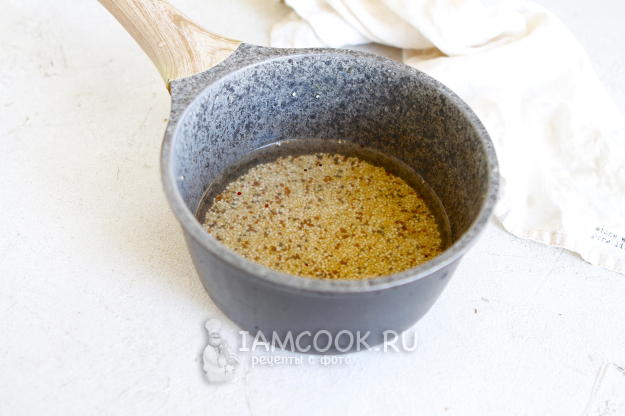 Сначала подготовим крупу. Ее обязательно нужно промыть перед варкой, иначе она может горчить. Промытую крупу переложите в кастрюлю и влейте воду 1:3. Поставьте кастрюлю на средний огонь и дождитесь, когда закипит вода. Слегка посолите, закройте кастрюлю крышкой и варите 15 минут.