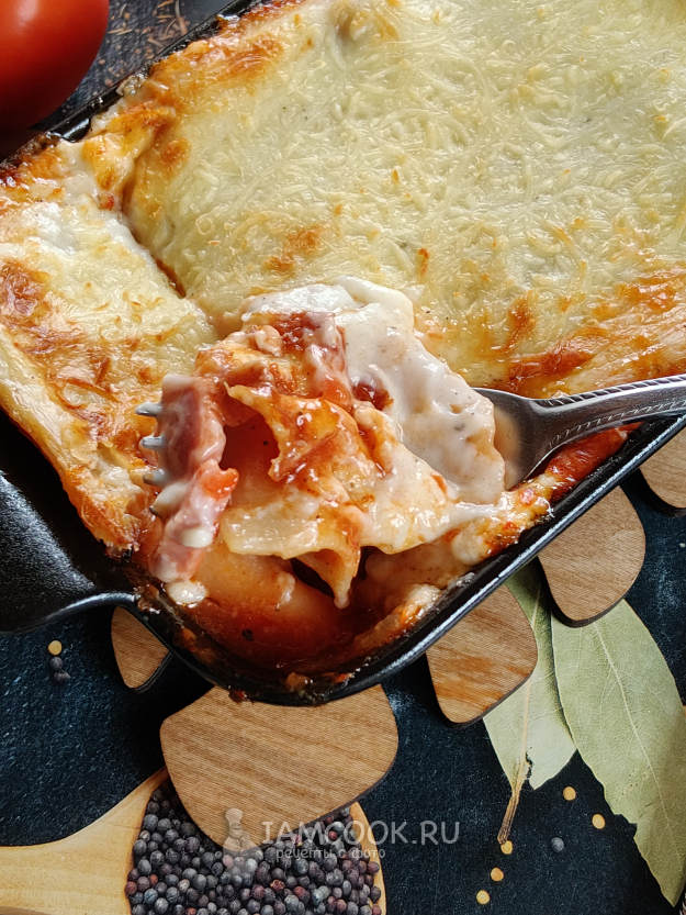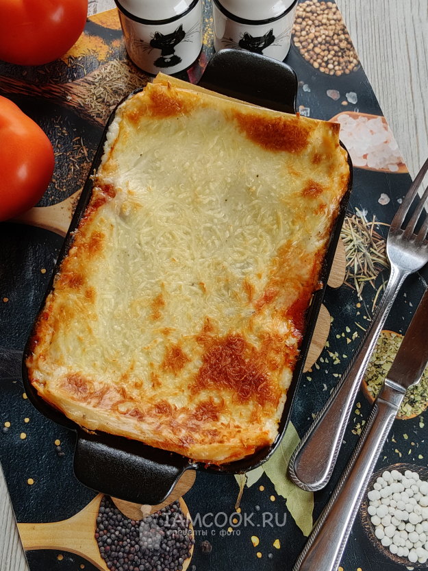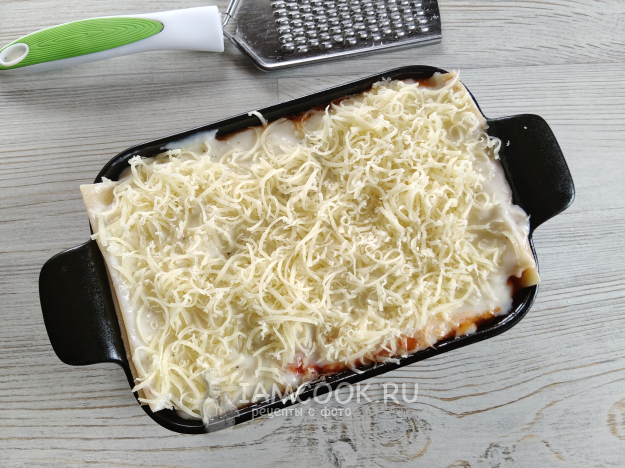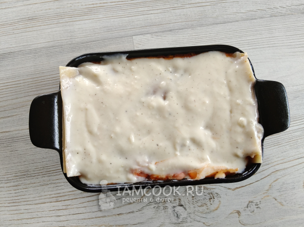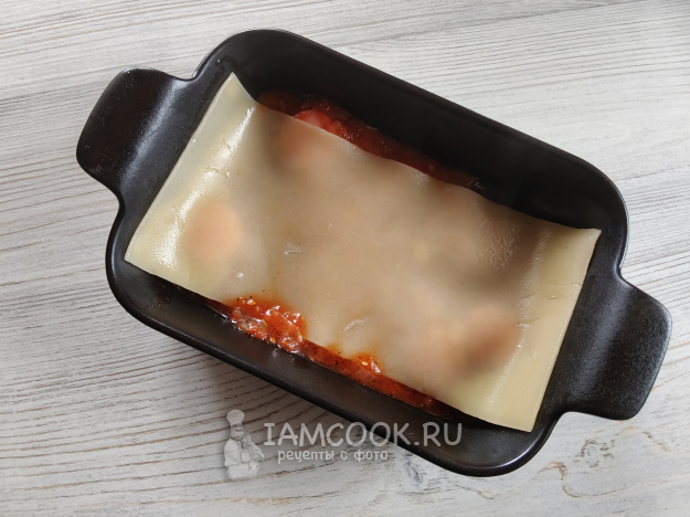 В форму для запекания (под размер листов) положить немного томатного соуса, прикрыть листом лазаньи.