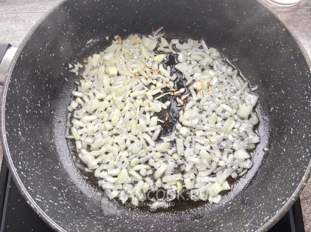 Мелко нарезанный лук поджарить на растительном масле до мягкости.
