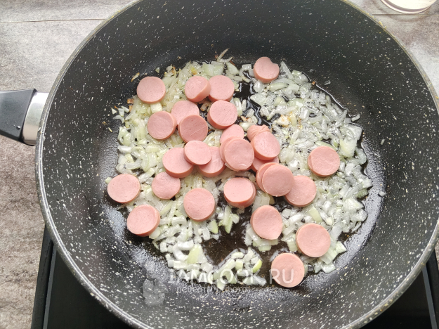 Добавить нарезанные сосиски (я изначально хотела сделать 4 шт., но потом решила, что и двух будет достаточно).