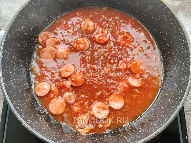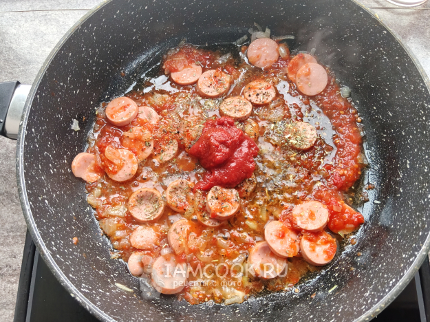 Слегка поджарить сосиски с луком, а затем добавить томатный соус, пасту, травы, соль и перец по вкусу.