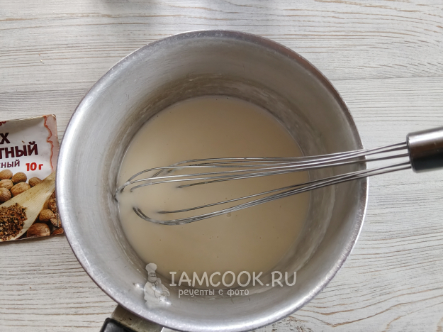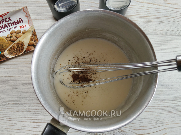 Добавить в соус соль, перец и мускатный орех.
