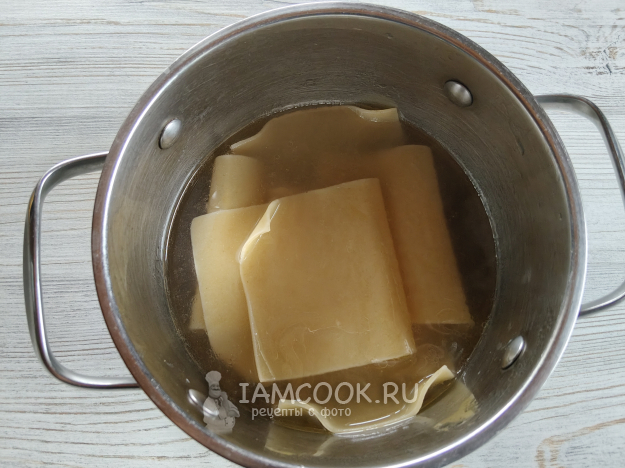 Отварить листы лазаньи в подсоленной воде согласно инструкции на упаковке. Лучше чуть-чуть не доварить, ведь они будут запекаться в соусе.