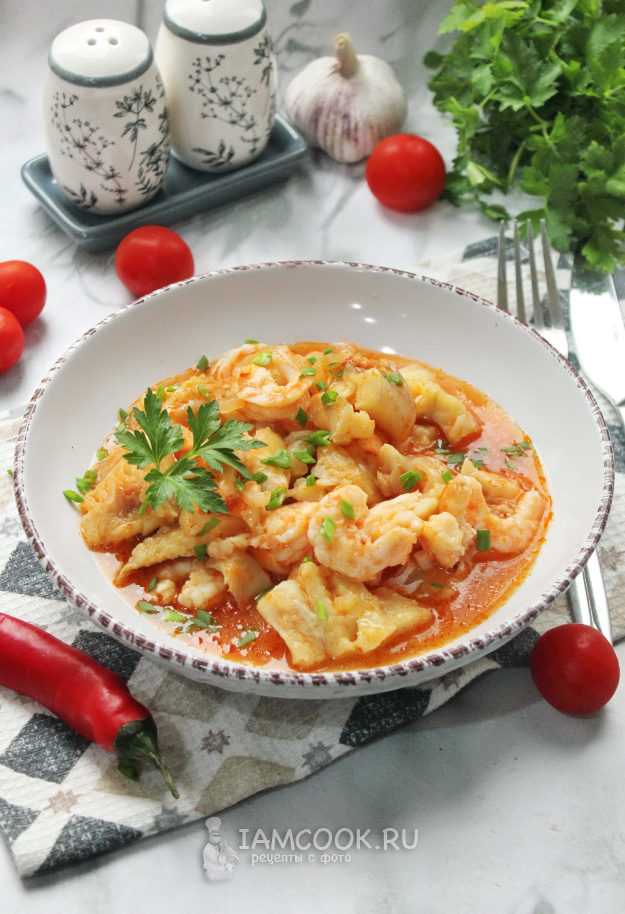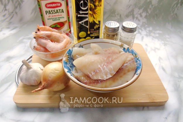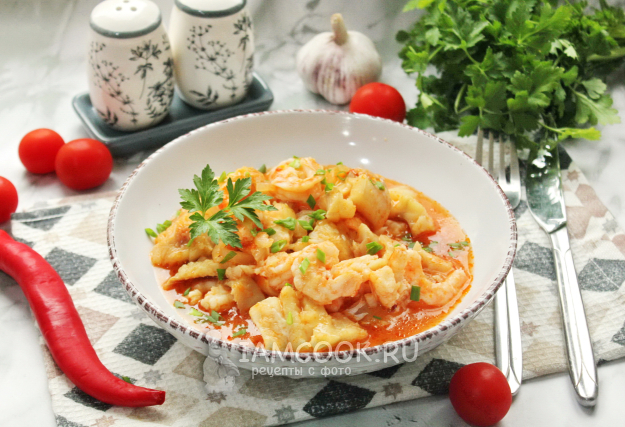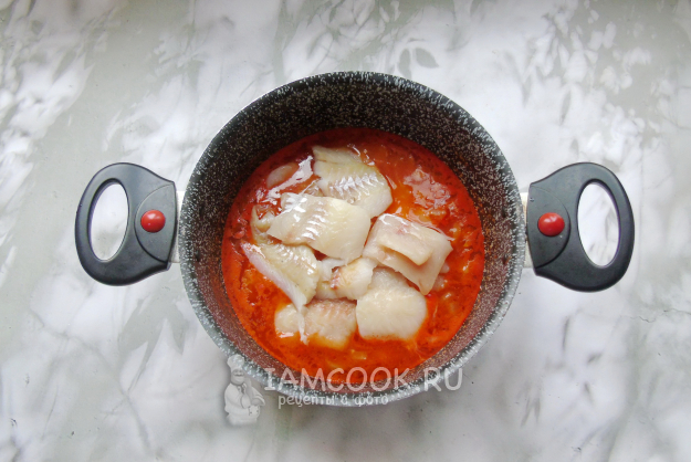 Филе минтая помойте и нарежьте кусочками. Выложите в кастрюлю с соусом, немного посолите.