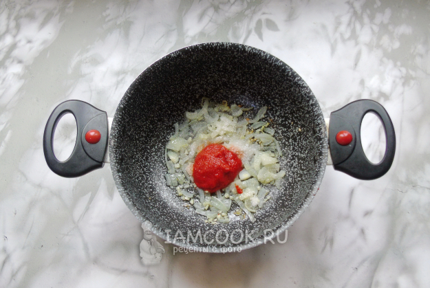 Жарьте овощи до прозрачности лука. После добавьте протертые помидоры, соль, перец и сахар.